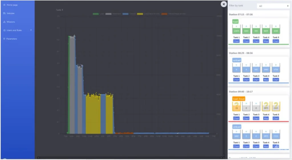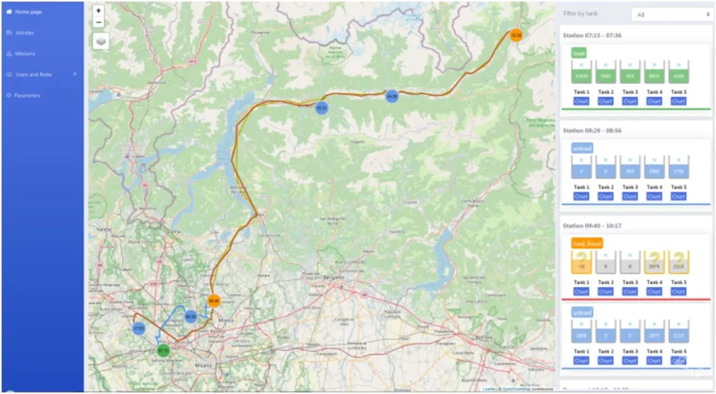 - Evidenziazione flessibile degli eventi. Dati disponibili per singola autobotte, per singola cisterna, per periodo, per quantitativo di litri, per singolo tragitto e missione dell’automezzo.