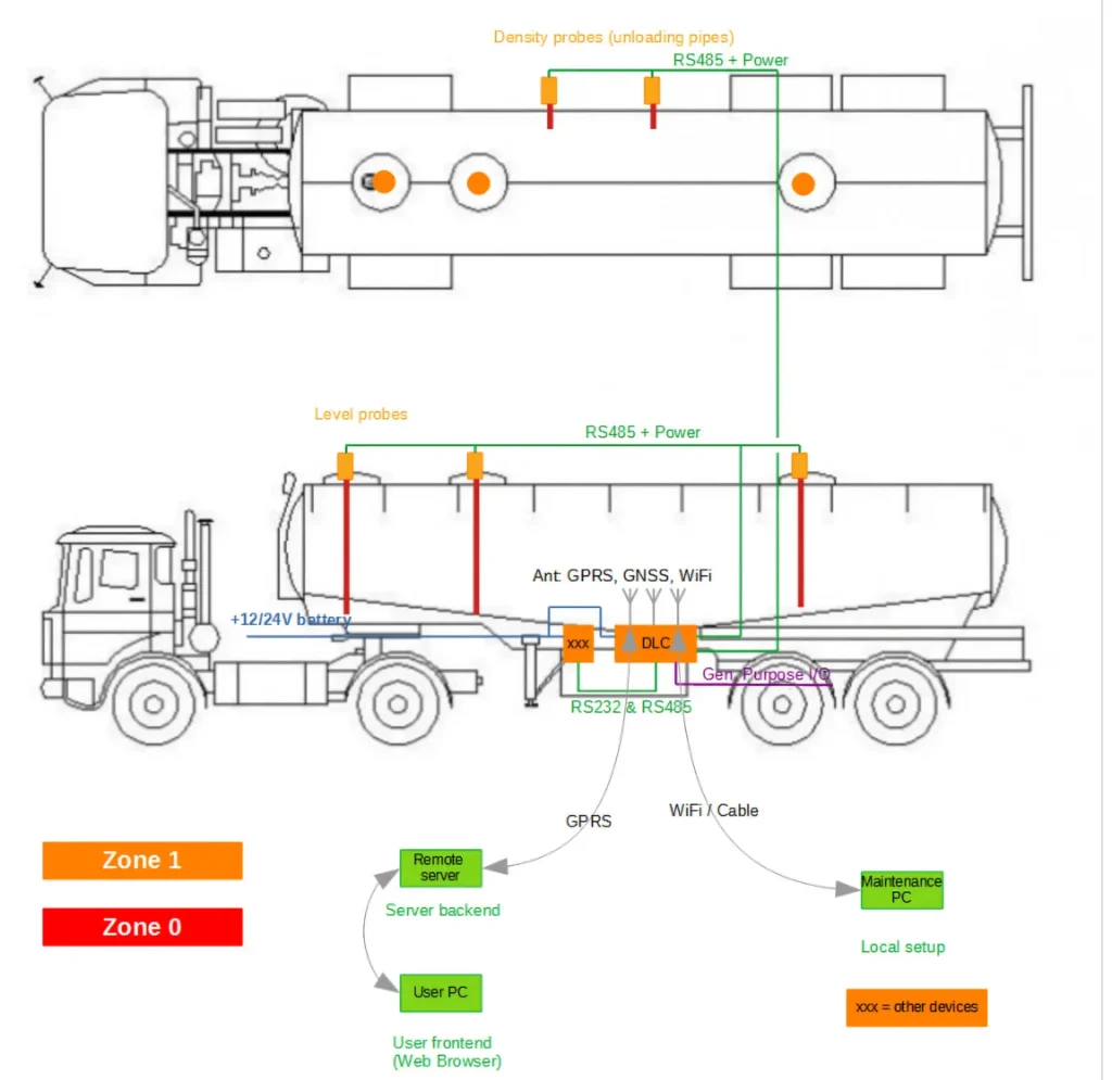 - Gestione fino a 10 cisterne e 2 sensori di densità